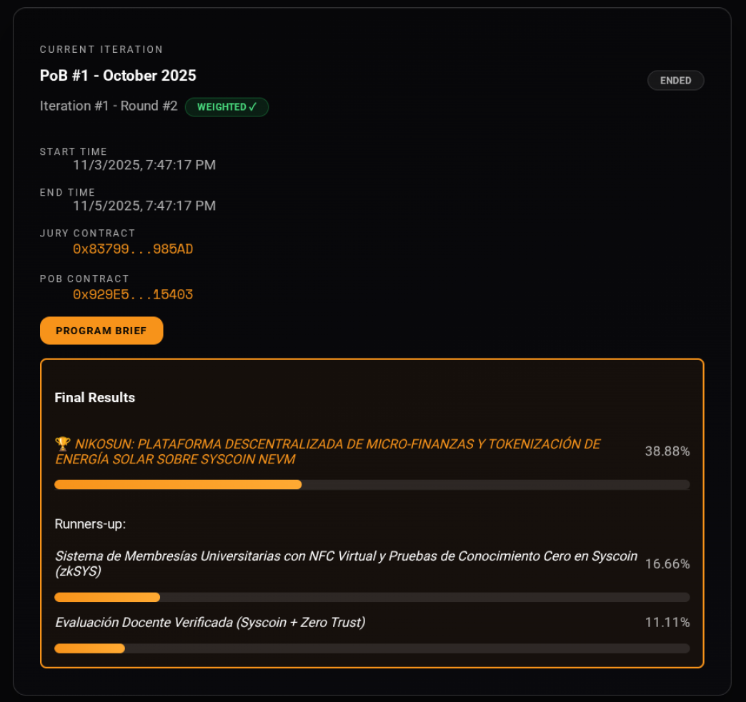 The first iteration of Proof-of-Builders moved from 10 candidates to 5 finalists and 1 winner: NikoSun, a decentralized platform for solar micro-finance and energy tokenization on Syscoin NEVM.