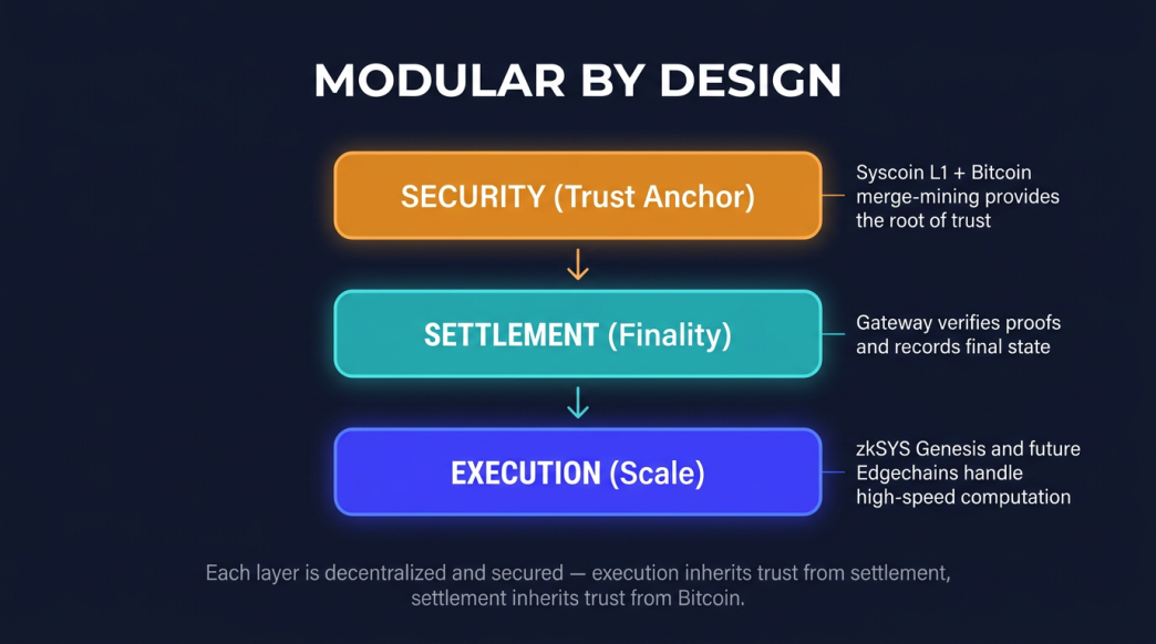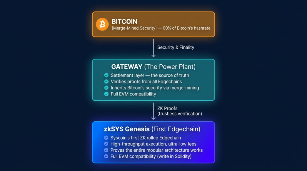 Syscoin L1 is intentionally hardened and minimal, its job is to be the most reliable settlement base possible, anchored to Bitcoin. Gateway extends that as the settlement layer for the execution fabric above it. And zkSYS Genesis is the high-throughput execution environment where computation actually scales.