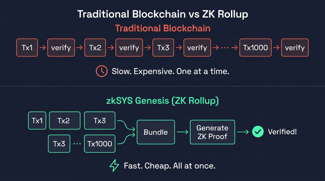 That's what zkSYS Genesis does. It processes transactions in batches, generates a cryptographic zero-knowledge proof that guarantees every transaction is valid, and submits that proof to Gateway. No trust required, the math speaks for itself.