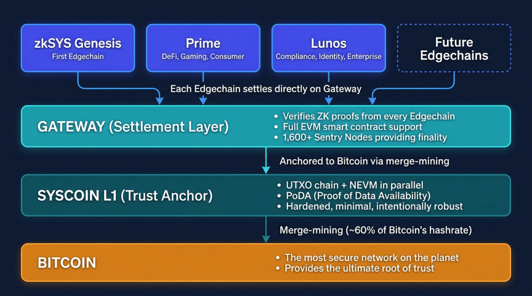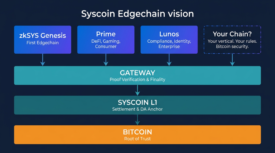 zkSYS Genesis is the first Edgechain, and it proves the model works. Edgechains are purpose-built, independent execution environments that each settle directly on Gateway. They inherit Syscoin's trust guarantees while running their own logic, economics, and vertical focus. Prime will serve DeFi and consumer applications. Lunos targets compliance and enterprise. And anyone can launch their own Edgechain for their specific use case, all as peers, all secured by Bitcoin.